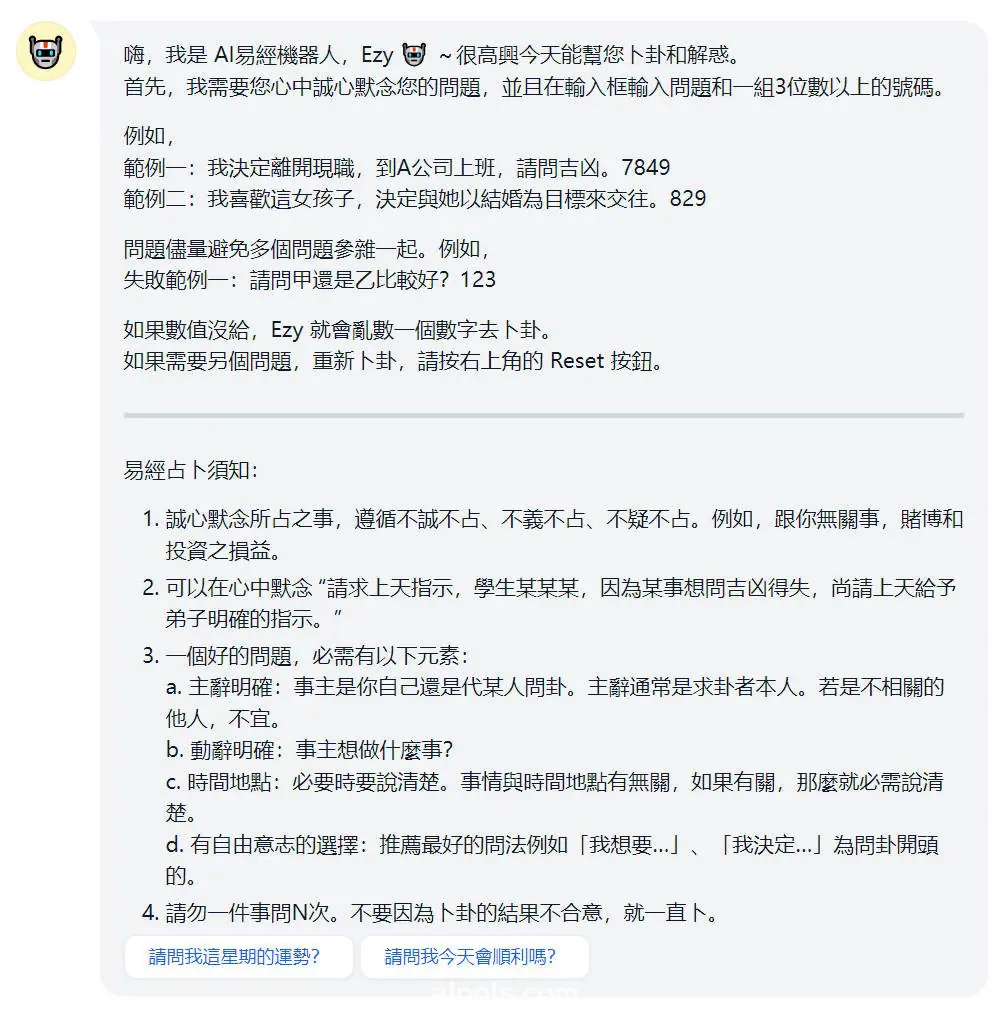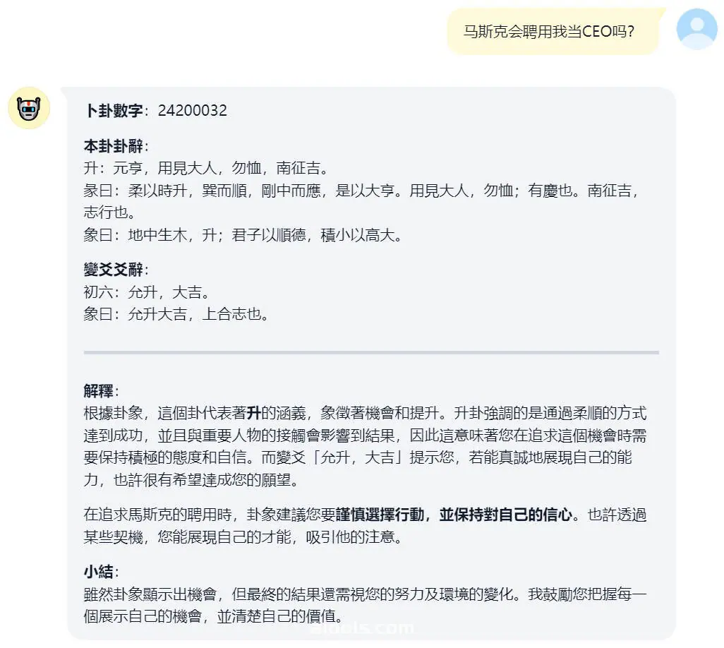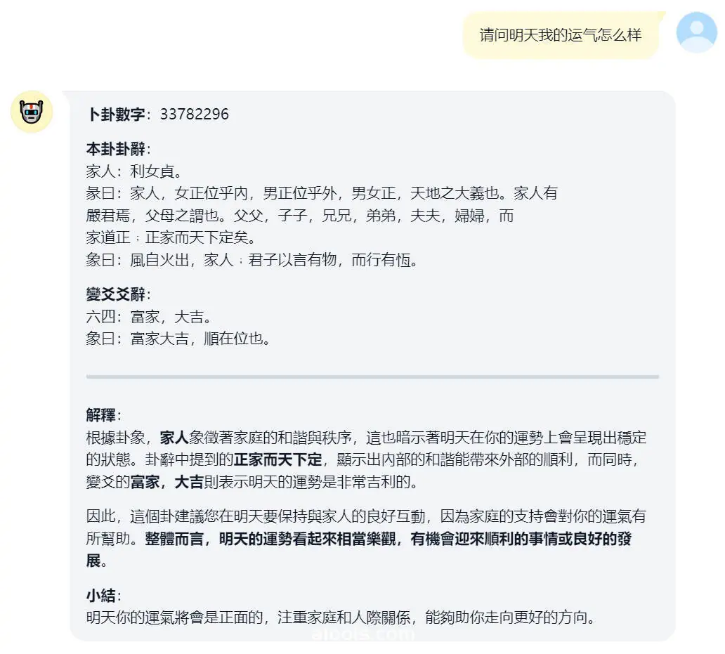 使用它方法十分简单,类似于普通的聊天机器人,但有几个关键点需要注意,开发者建议大家在提问时尽量保持问题单一,避免在一个问题中混杂多个询问点。其次,在问题末尾添加一组至少三位数的数字,例如:“请问甲还是乙比较好?369”。这些数字可以随意输入,AI会根据这个数字来进行卜卦。如果不输入数字,则AI将依据当前的时间来完成卜卦。