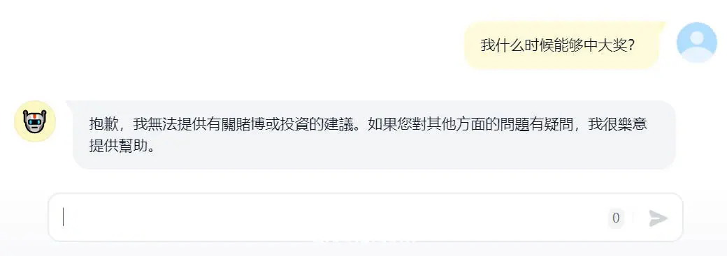 我先试着问了下“我什么时候能够中大奖?”,这样的问题,它告诉我它无法回答有关赌博和投资的问题,好吧。